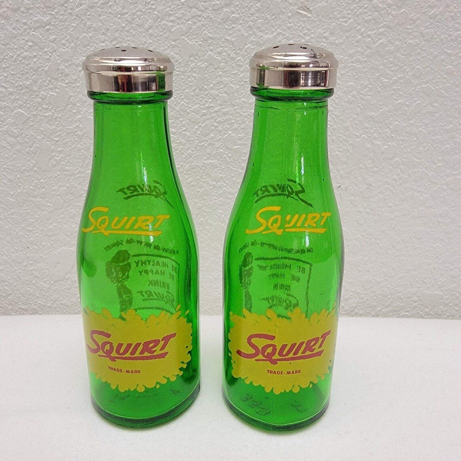 Squirt Glass Bottle Salt & Pepper Shakers Metal Tops Green Glass “I’m Squirt”